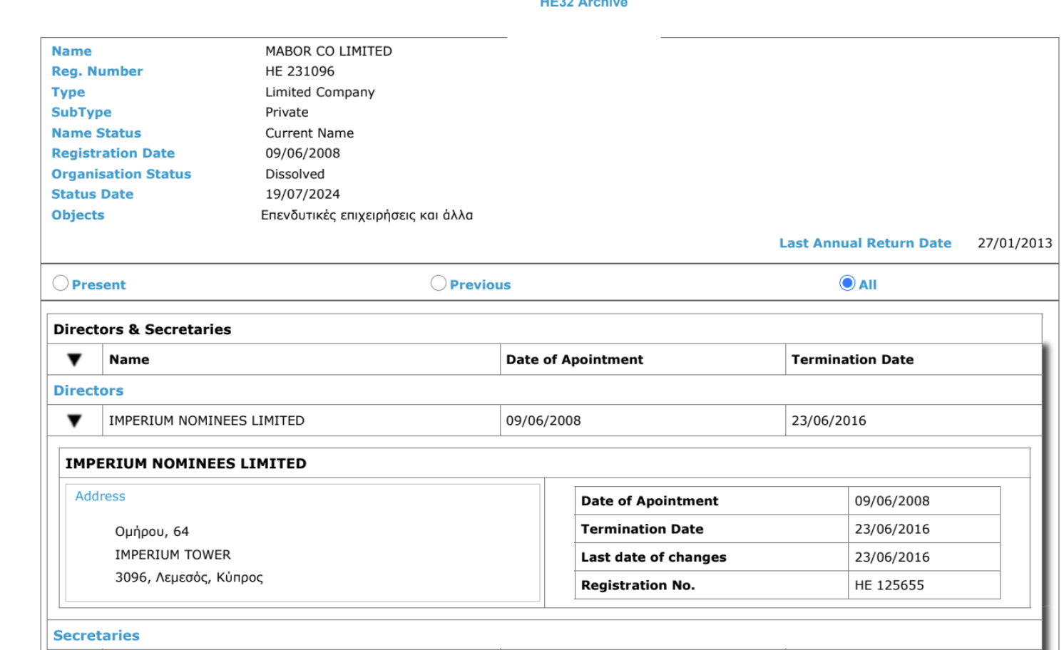 Сам экс-прэзідэнт Кіпру меў не толькі апасродкаванае, але і наўпроставае дачыненне да гэтай схемы. Да 2013 году Нікас Анастасіядыс быў саўладальнікам кампаніі Imperium Services. Яна была сакратаром Profax, у тым ліку тады, калі Юры Чыж знаходзіўся пад санкцыямі ЕЗ.