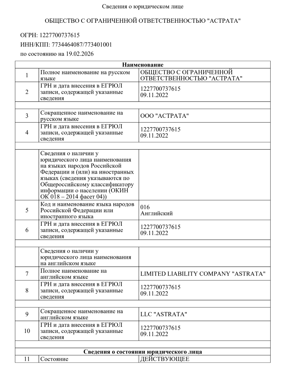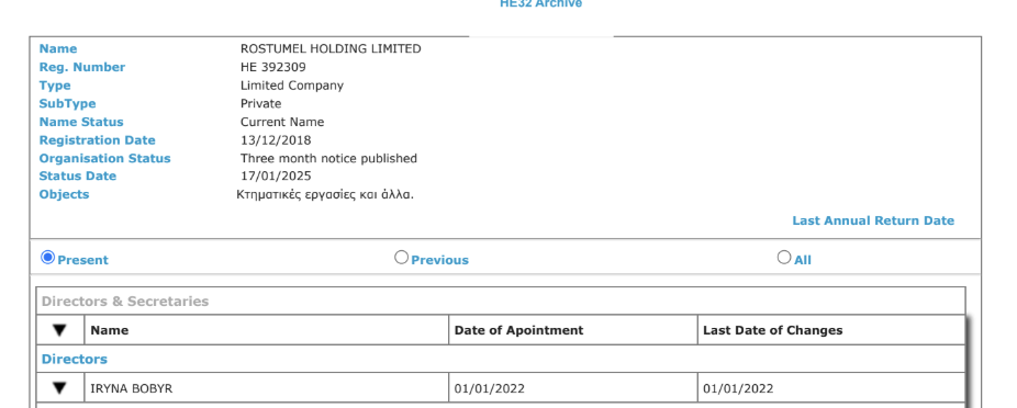 Кампанія «Астрата» з 9 ліпеня 2025 года на 80% належыць фігуранту некалькіх нашых расследаванняў Андрэю Свірыдаву. [*] [*] [*] Гэты грамадзянін Беларусі з 2019 па 2021 гады быў намеснікам тагачаснага кіраўніка справамі Аляксандра Лукашэнкі — Віктара Шэймана. Рэштай «Астраты» на момант выхаду матэрыялу валодала крымчанка з расейскім пашпартам Кацярына Карніенка. Да сярэдзіны 2025-га фірма ёй належала цалкам. Сувязь Карніенка і Свірыдава прасочваецца і праз іншую кампанію. З сакавіка 2022 года Карніенка займала пасаду дырэктара ТАА «ПИК», якім з красавіка 2019-га па кастрычнік 2022-га валодала кіпрская кампанія Rostumel Holding Limited (далей — Rostumel). [*] [*] [*] У апошняй, як пазначана ў даверанасці, станам на чэрвень 2024-га фінансавым дырэктарам значыўся Свірыдаў. [*]