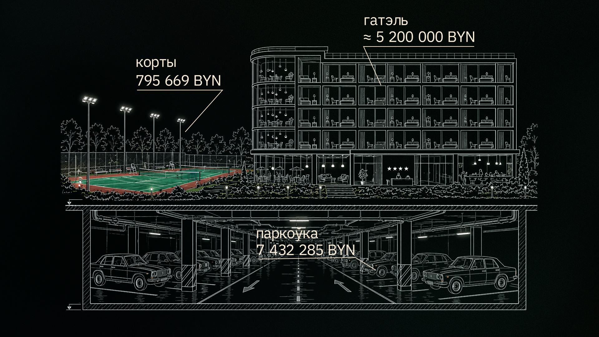 У 2020 годзе «БелГлобалГарант» у каштарысах ацаніў аб’екты нерухомасці, якія планаваў перадаць на баланс РЦАП па тэнісе, у 9,5 млн беларускіх рублёў (каля $3,5 млн), а іх рынкавы кошт — не менш за 14 млн рублёў (каля $5 млн). Аднак фактычныя выдаткі кампаніі былі значна меншыя, напрыклад, будаўніцтва тэнісных кортаў каштавала каля мільёна беларускіх рублёў. [*] [*] [*] [*] Паводле бізнес-плану, на гасцініцу разам з адпаведнай інфраструктурай павінны былі выдаткаваць 5 млн беларускіх рублёў. Колькі каштавала будаванне гатэля ў выніку і ці было яно скончана, мы не ведаем: у акце прыёмкі ў эксплуатацыю абʼекта ад 12 студзеня 2024 года гатэля няма. На кадастравай мапе мы яго таксама не знайшлі. [*]