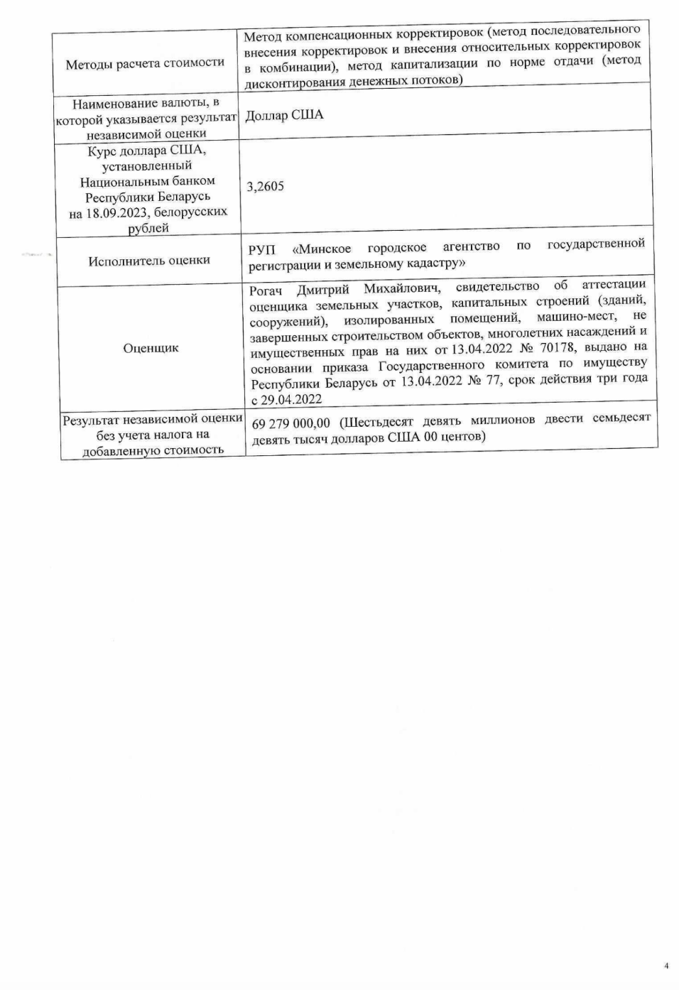 У верасні 2023 года кампанія «БелГлобалГарант» замовіла незалежную ацэнку будучага аб’екта нерухомасці. Экспертызу правяло РУП «Менскае гарадское агенцтва па дзяржаўнай рэгістрацыі і зямельным кадастры». Вынік ацэнкі — $69,3 млн без уліку падатку на дададзеную вартасць. [*] [*]