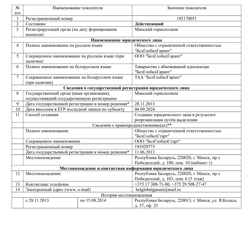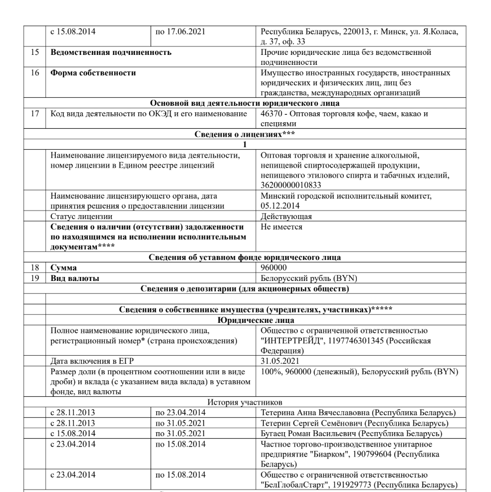 Крыніца: БРЦ / Раней «БелГлобалГарант» належаў Сяргею Цяцерыну і чальцу праўлення РГА «Беларуская тэнісная федэрацыя» Раману Бугайцу. У траўні 2021 года, за месяц да ўвядзення санкцый ЕЗ супраць Цяцерына, права ўласнасці перадалі расейскай кампаніі ТАА «Интертрейд». Яе ўладальнік на момант публікацыі – жыхар Варонежу Мікіта Марозаў. Марозаў стварыў у кампаніі раду дырэктараў, але не ўвайшоў у яе. Затое ўвайшлі былыя ўласнікі – Цяцерын і Бугаец