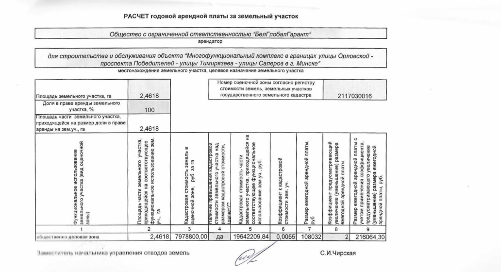 Інвестар, які атрымаў зямлю пад будаўніцтва ў цэнтры Менску, — ТАА «БелГлобалГарант». Гэта стала магчымым дзякуючы асабістаму даручэнню Аляксандра Лукашэнкі, якое той падпісаў 5 сакавіка 2020 года. Штопраўда, кампанія атрымала зямлю не ў прыватную ўласнасць, а ў арэнду. [*] [*] [*]