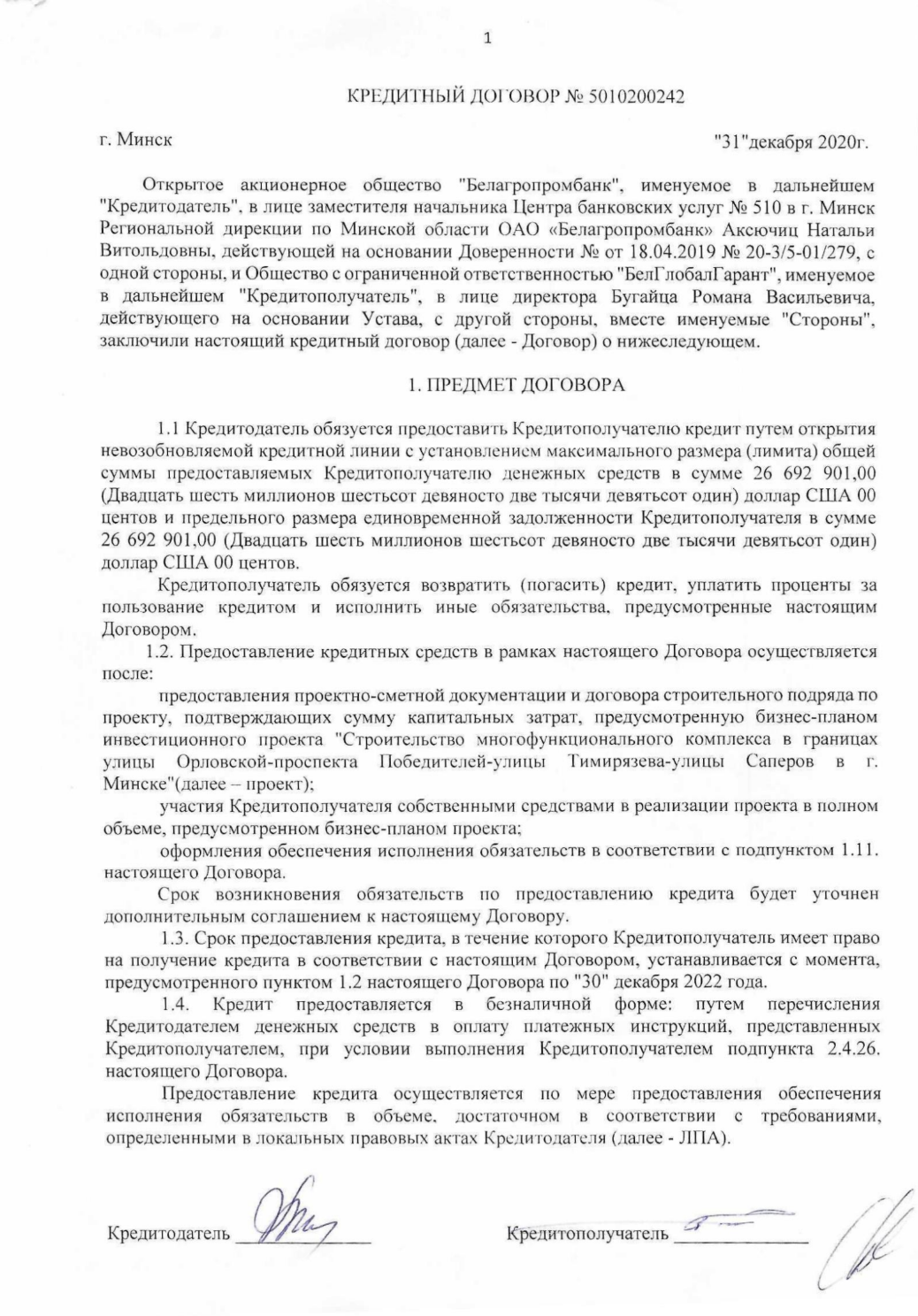 Паводле бізнес-плану, уласныя выдаткі інвестара мелі пакрыць толькі 3% агульнага аб'ёму коштаў. Напрыканцы 2020 года дзяржаўны «Белаграпрамбанк» адкрыў для «БелГлобалГарант» крэдытную лінію на $26,7 млн. [*] Пазыку далі да 2033 года пад 6% гадавых. [*]  У якасці закладу «Белаграпрамбанк» атрымаў маёмаснае права на будучы комплекс, кошт якога ў дамове ацанілі ў $22,8 млн. [*]