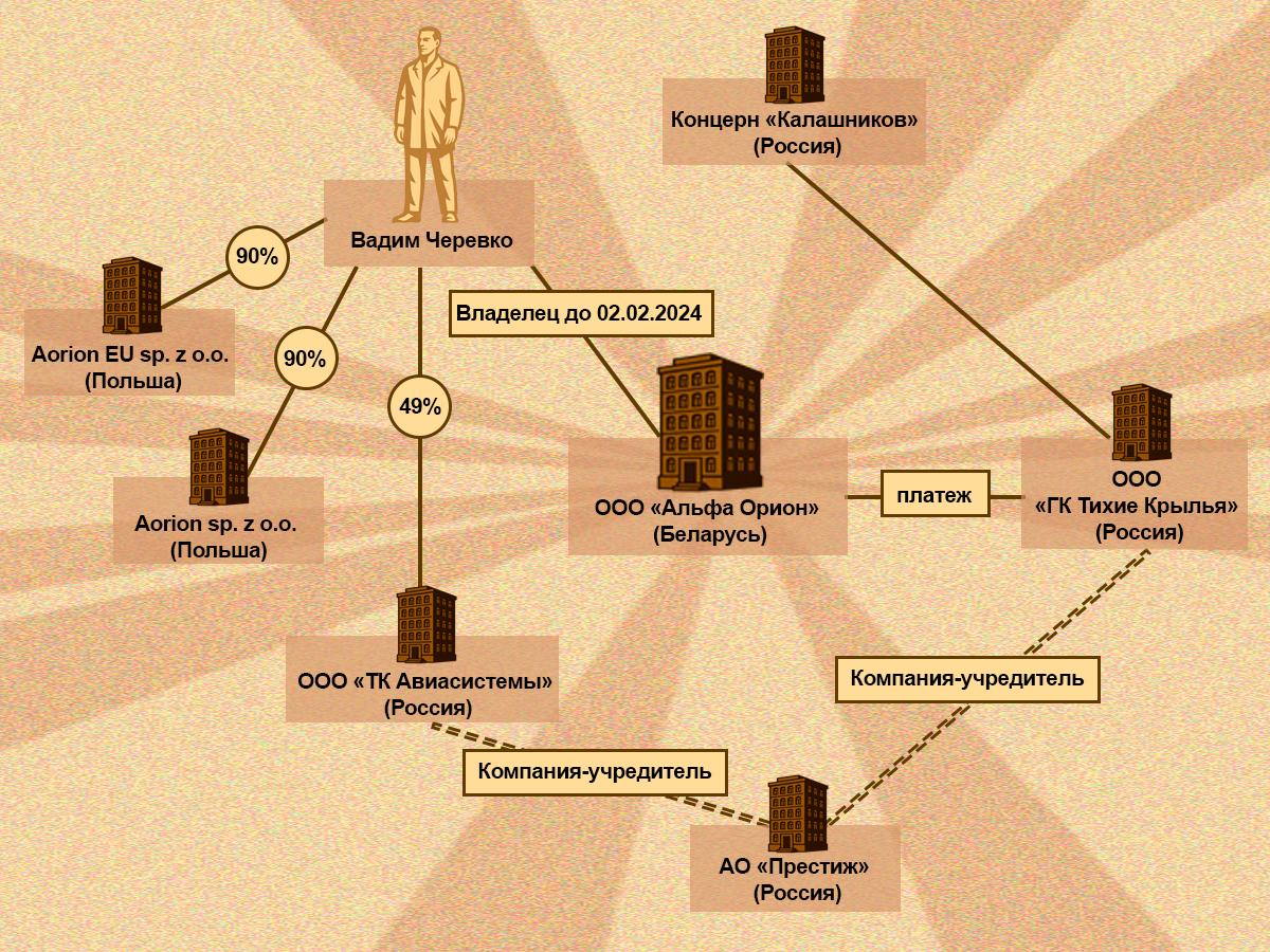 Факты биографии учредителя «Альфа Орион» Вадима Черевко могут показаться несовместимыми между собой. В России он владеет 49% связанным с концерном «Калашников» ООО «ТК Авиа системы» (в комментарии БРЦ Черевко назвал компанию пустышкой), при этом находится в розыске. [*] [*] [*] В ЕС — владеет 90% польских компаний Aorion sp. z o.o. и Aorion EU sp. z o.o. Черевко «вместе с определенными партнерами» пытался найти инвестиции для развития бизнеса в Европе, рассказал БРЦ представитель «Альфа Орион», но привлечь деньги так и не удалось.