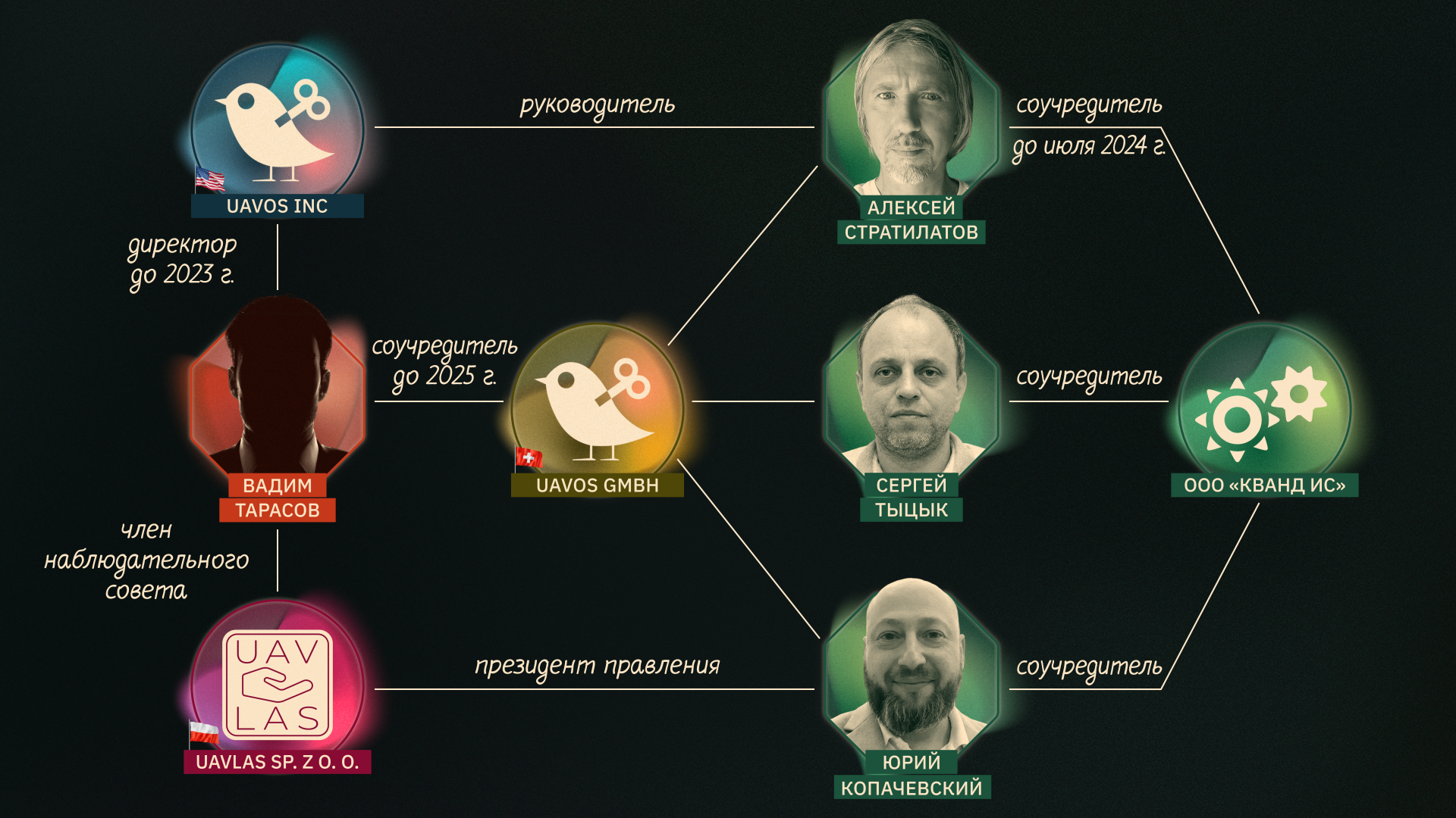 Это, однако, не помешало соучредителям «Кванд Ис» через сеть других компаний вести бизнес на американском рынке. [*] [*] Последняя в цепочке — зарегистрированная в США компания UAVOS INC. Ее директором как минимум до 2023 года был россиянин с израильским паспортом Вадим Тарасов. Он же до сентября 2025 года был соучредителем швейцарской компании UAVOS GmbH, которой в разное время владели соучредители беларусской «Кванд Ис» Юрий Копачевский, Алексей Стратилатов (по совместительству — руководитель американской UAVOS) и Сергей Тыцык. Против последнего США ввели санкции летом 2024 года. Также Тарасов на момент публикации является членом наблюдательного совета польской UAVLAS sp. z o. o. [*]