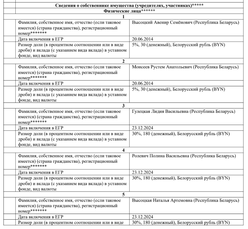 Четверо из пяти учредителей компании, которая заняла второе место в нашем рейтинге, связаны родственными отношениями. Сморгонским ООО «ВТТ» владеют сестры Лидия Гулецкая и Полина Ролевич (обе до замужества Высоцкие), их мать Наталья и дядя Авенир. Пятый — знакомый семьи Рустем Моисеев. [*] [*] Публичной информации о тройке последних мало, например, мы знаем, что Наталья и Авенир на пенсии. Лидия и Полина связь с компанией не афишируют: первая занимается режиссурой, вторая в инстаграме рассказывает о кондитерском деле. Все вместе они зарабатывают в том числе на контрактах с российскими производителями оружия.