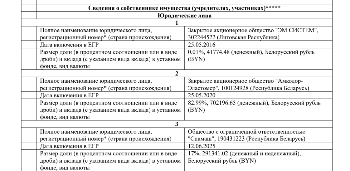 Опровержение: Это неправда, во всех трех фирмах контрольные доли находятся в руках Александра Шакутина и его семьи: «Амкодор-Эластомер» — через компанию «Спамаш», [*] СООО «Проди» — через «Амкодор-Эластомер» и «Амкодор-Спамаш», [*] [*] «Салео» — управляющая компания холдинга — через ООО «Наванеп». [*] [*] [*]