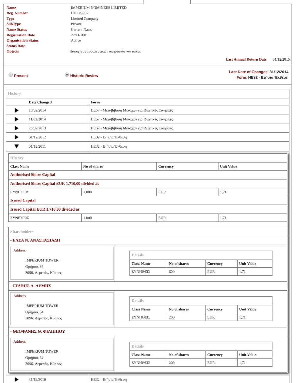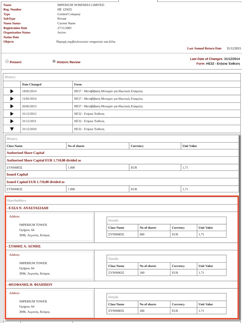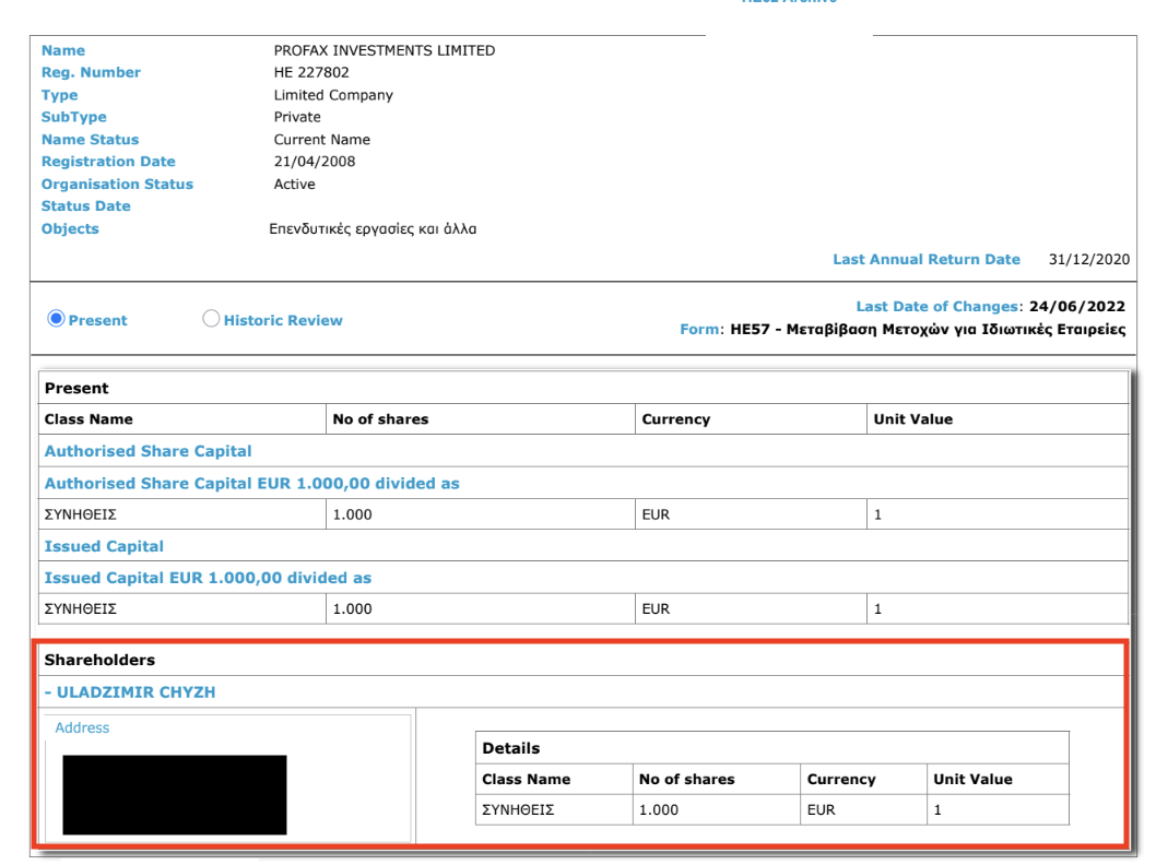 Сам экс-прэзідэнт Кіпру меў не толькі апасродкаванае, але і наўпроставае дачыненне да гэтай схемы. Да 2013 году Нікас Анастасіядыс быў саўладальнікам кампаніі Imperium Services. Яна была сакратаром Profax, у тым ліку тады, калі Юры Чыж знаходзіўся пад санкцыямі ЕЗ.