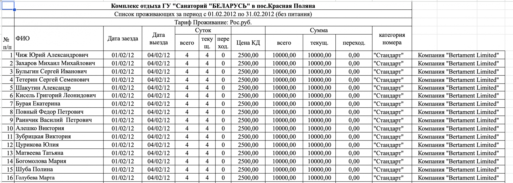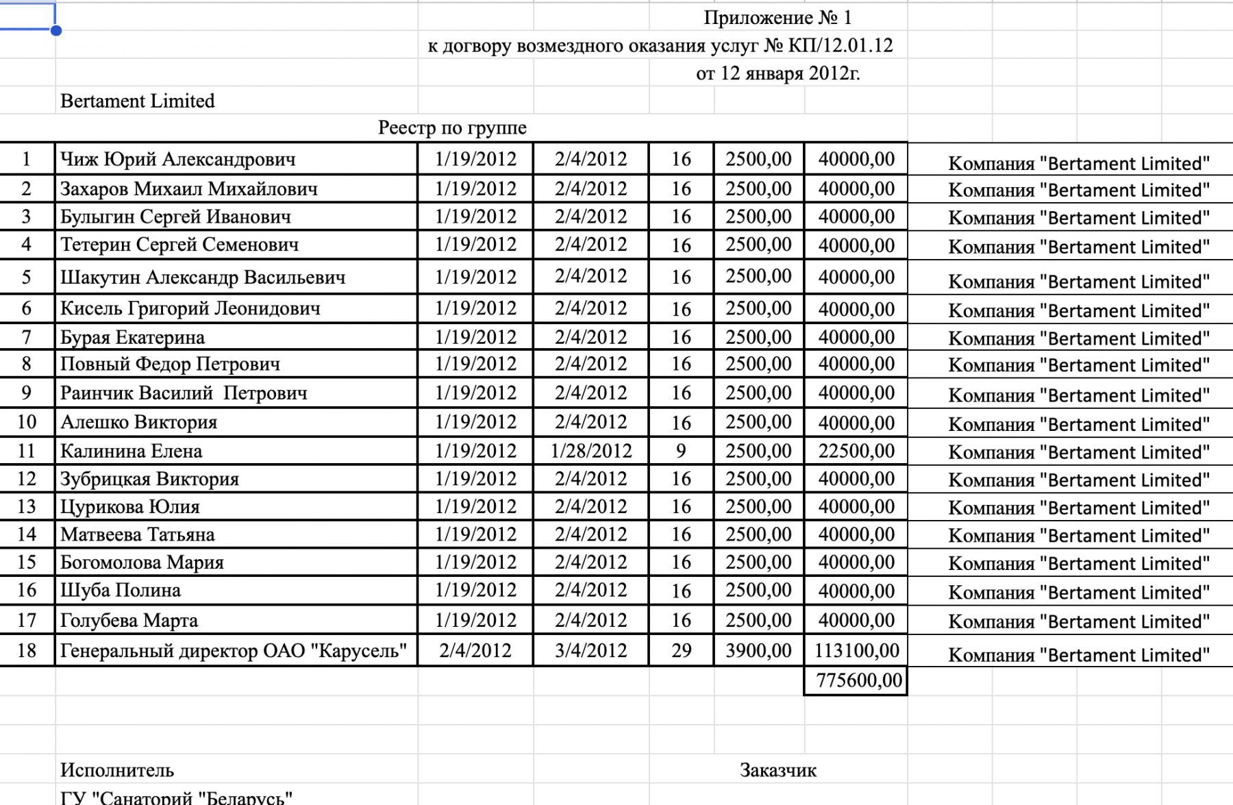 У студзені 2012 году, у разгар кантрабанднай схемы, кіпрская фірма Bertament Limited заключыла дамову з санаторыем «Беларусь» на гарналыжным курорце «Красная Паляна» на 16-дзённае пражыванне групы беларусаў. На дамове з боку Bertament Limited — імя Тэафаніса Філіпоў, бізнес-партнёра экс-прэзідэнта Кіпру. З дапамогай «Рабочага Руху» мы знайшлі спіс гэтых гасцей санаторыя, якія выязджалі ў дзень, указаны ў дамове. [*] [*] [*]