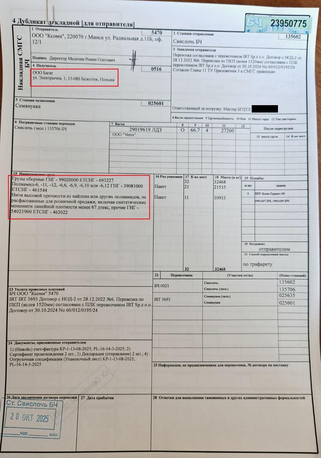 Праз дылера ТАА «Белнефтехим-Рос» і іншых атрымальнікаў у РФ з 2022 па ліпень 2025 года паставілі тысячы тон поліаміду і нітак на дзясяткі мільёнаў долараў.