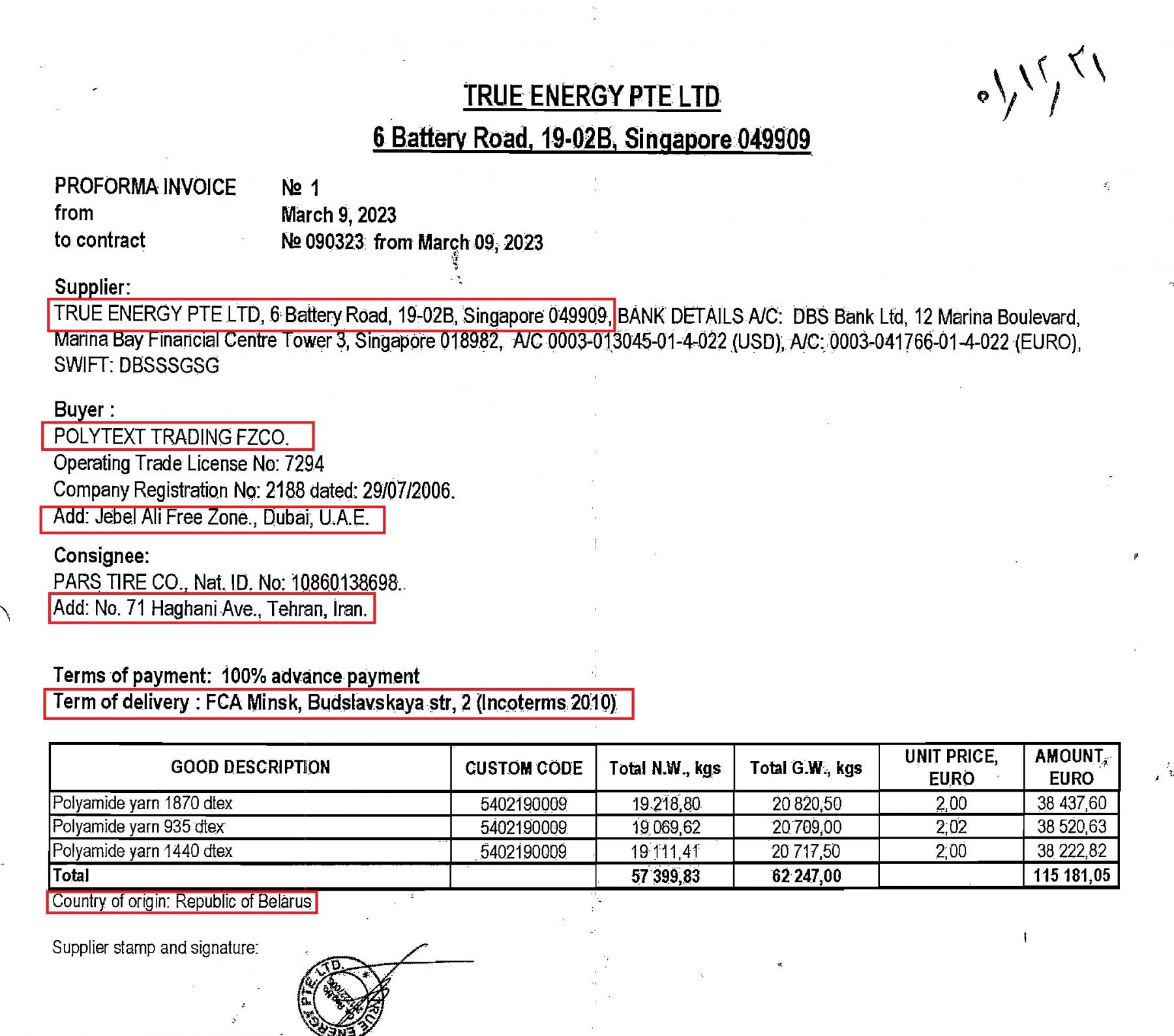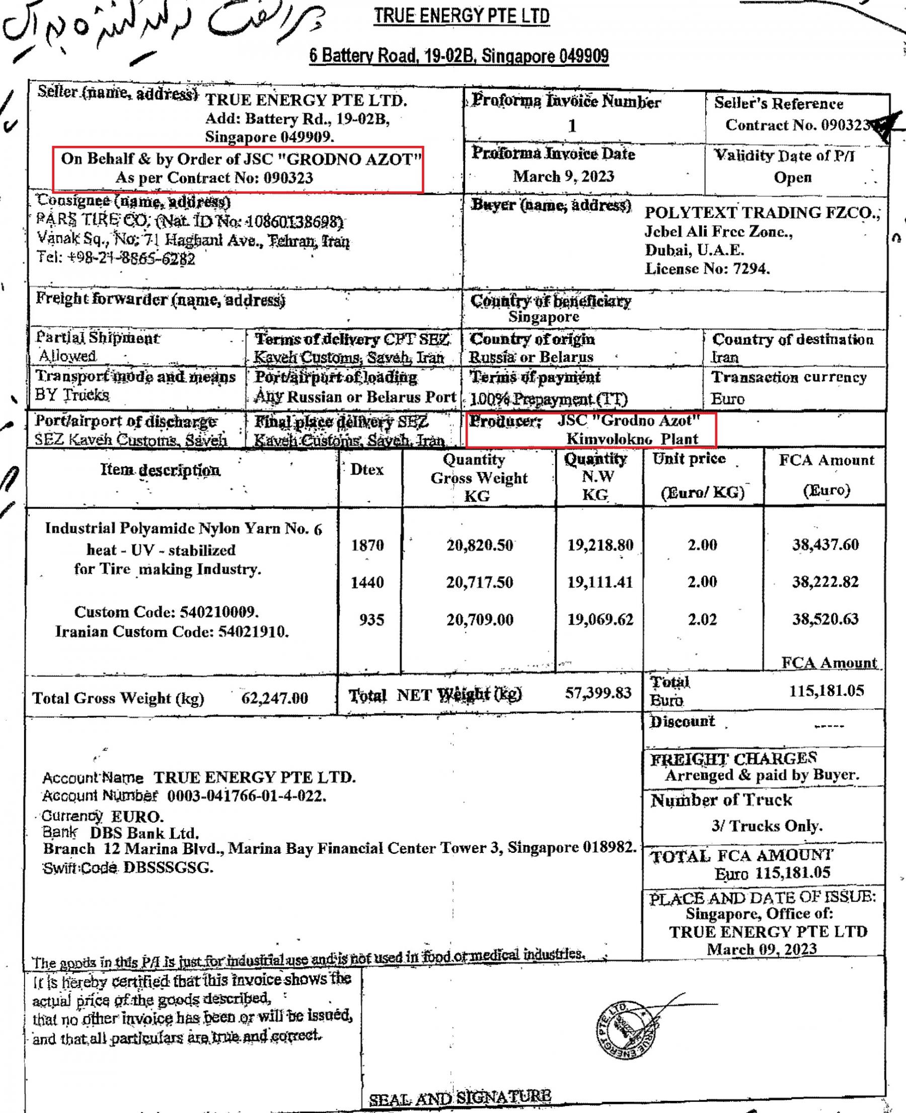 Бакі дамовіліся аб пастаўцы нітак з «Гродна Азот». Фармальным прадаўцом стала сінгапурская фірма True Energy PTE. LTD, але адпраўлялі тавар з адрасу, дзе зарэгістравана аднайменнае беларускае ТАА «Сапраўдная Энергія» і «Ар-бел камодытэс», што належыць Карасцялёву. [*] [*] На паперы тавар купіла фірма, зарэгістраваная ў Арабскіх Эміратах, але адрас дастаўкі — Тэгеран. [*]