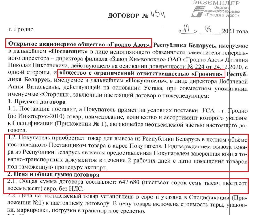 Не перакладаючы ўсю адказнасць на замоўнікаў, варта адзначыць: падсанкцыйнае дзяржпрадпрыемства «Гродна Азот» зарабляе на вайне, пастаўляючы сыравіну прадпрыемствам, звязаным з расейскім ВПК, і адначасова выводзіць сваю прадукцыю ў Еўразвяз праз фірмы-пракладкі. Дакументы, кантракты і ліставанні, сабраныя БРЦ, паказваюць, што гаворка ідзе не пра адзінкавы абыход абмежаванняў, а пра адладжаную схему, якая працуе гадамі. Санкцыі, уведзеныя за рэпрэсіі ў дачыненні да грамадзянскай супольнасці, не спынілі паток — яны толькі змусілі змяніць маршрут.