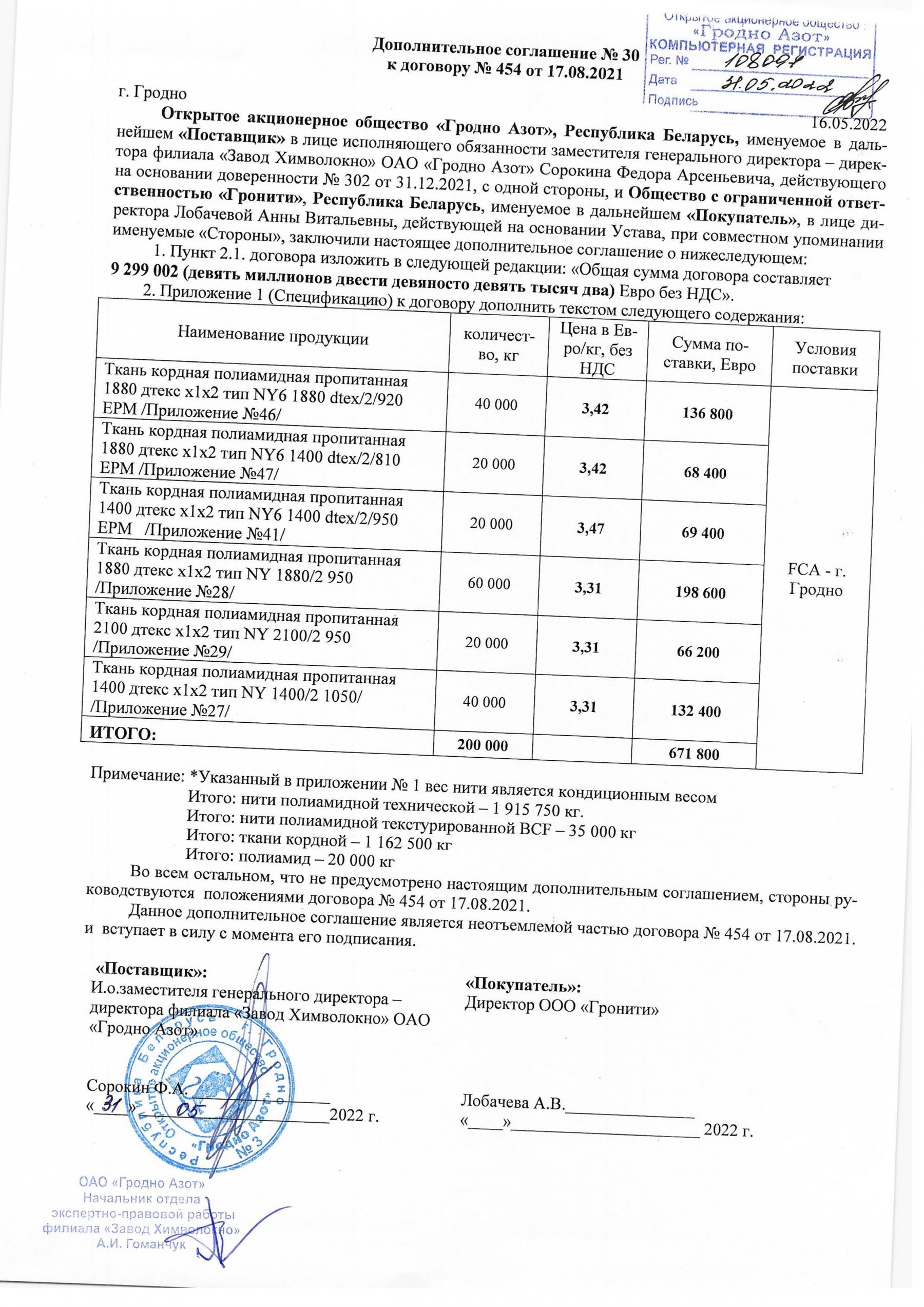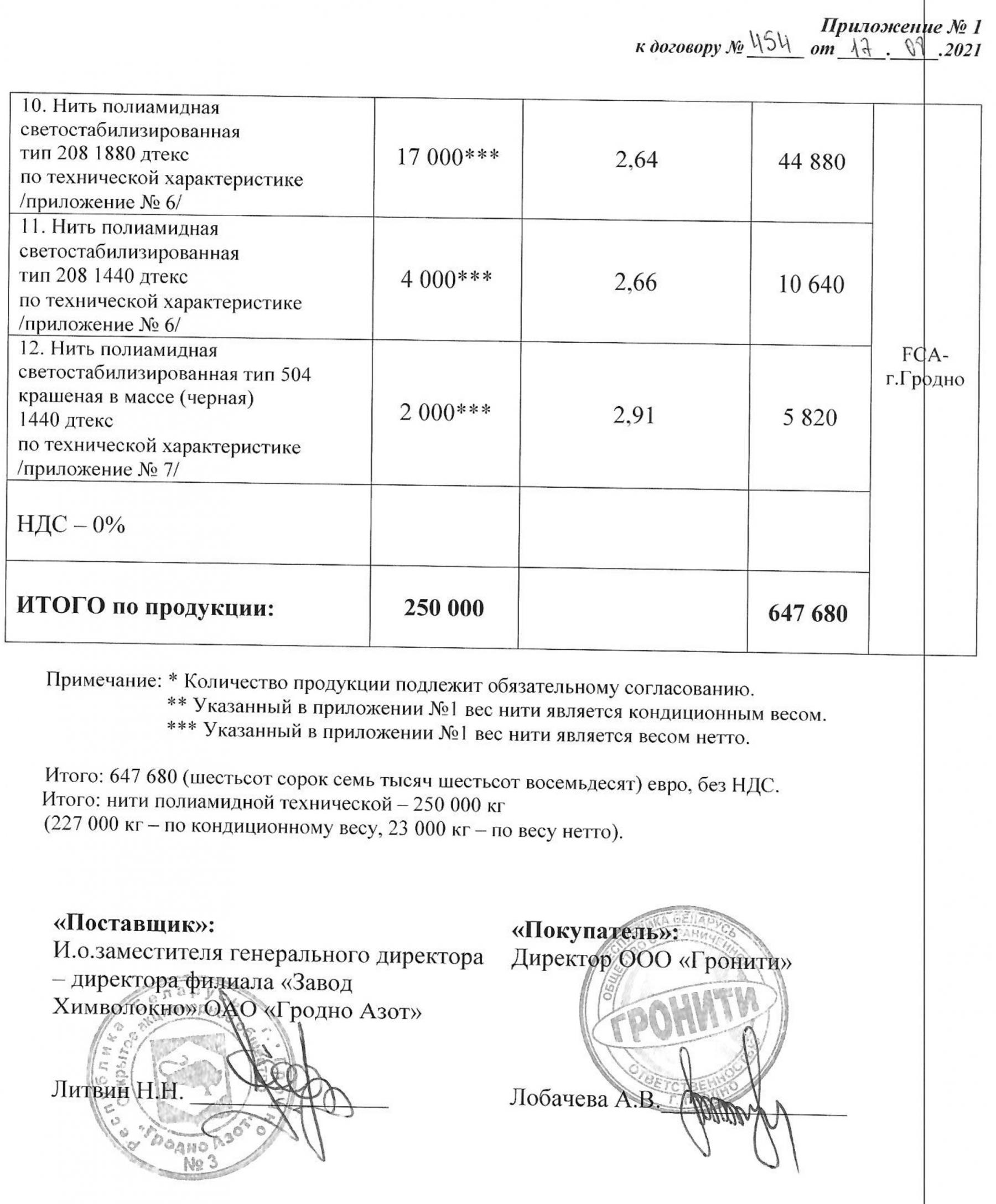 Ролю «Гроніці» ў пастаўках забароненай прадукцыі ў ЕЗ пацвярджае дакумент, які БРЦ атрымаў ад «Рабочага руху». Кампанія падпісала з «Гродна Азотам» дамову №454 у жніўні 2021 года «для вывазу з Беларусі ў поўным памеры» поліаміднай ніткі на амаль €650 тыс. [*] [*] [*] Пасля гэты дакумент абнаўлялі і пашыралі спіс прадукцыі на вываз. [*]
