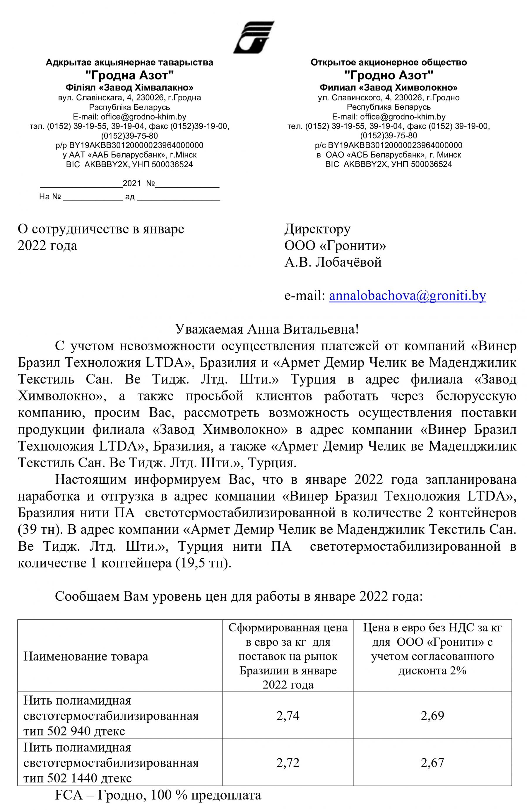 Падсанкцыйнае дзяржпрадпрыемства дало афіцыйны дазвол змяняць паходжанне свайго тавару пры продажы яго ў Еўразвяз. Пра гэта мы даведаліся з ліставання прадстаўнікоў абедзвюх фірмаў. Напрыканцы лістапада 2021-га, за два дні да пачатку дзеяння ўжо еўрапейскіх санкцый, выконваючы абавязкі намесніка дырэктара філіялу «Завод Хiмвалакно» Федар Сарокін напісаў дырэктарцы «Гроніці» Ганне Лабачовай, што прадпрыемства не мае нічога супраць, «каб пры афармленні экспартнай мытнай дэкларацыі ад імя ТАА “Гроніці”, у якасці вытворцы ўказвалі ТАА “Гроніці”». Дадзенае ўзгадненне павінны былі прымяняць для паставак прадукцыі заводу ў Літву. [*]