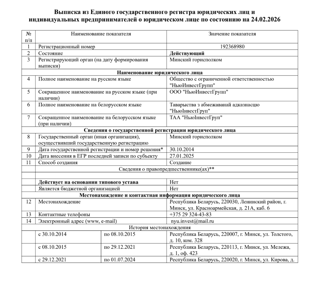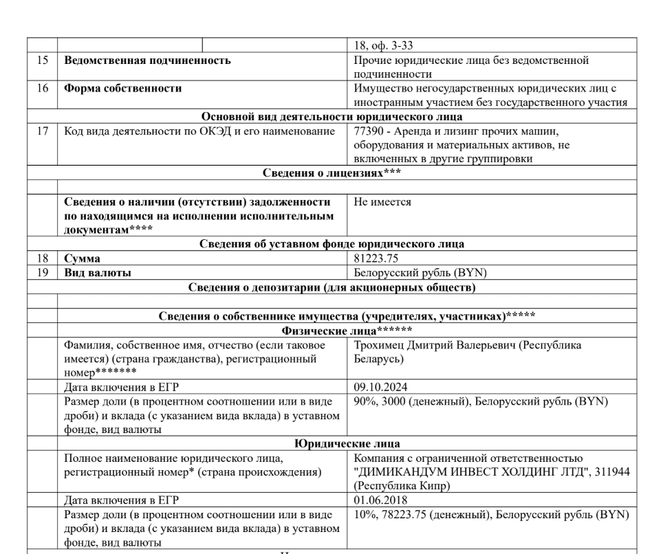 У 2024-м адпраўлялі аўты ў РФ таксама дзве беларускія юрыдычныя асобы — ТАА «НьюІнвестГруп» і ТАА «ЛегіёнГрупІнвест». Першая працягнула і ў 2025-м. Яна з чэрвеня 2018-га па кастрычнік 2024-га цалкам належала фірме Dimicandum Invest Holding LTD (далей — Dimicandum), фінансавым дырэктарам якой быў Андрэй Свірыдаў. Ён жа з чэрвеня 2024-га кіруе «ЛегіёнГрупІнвест». [*] [*] [*] [*]