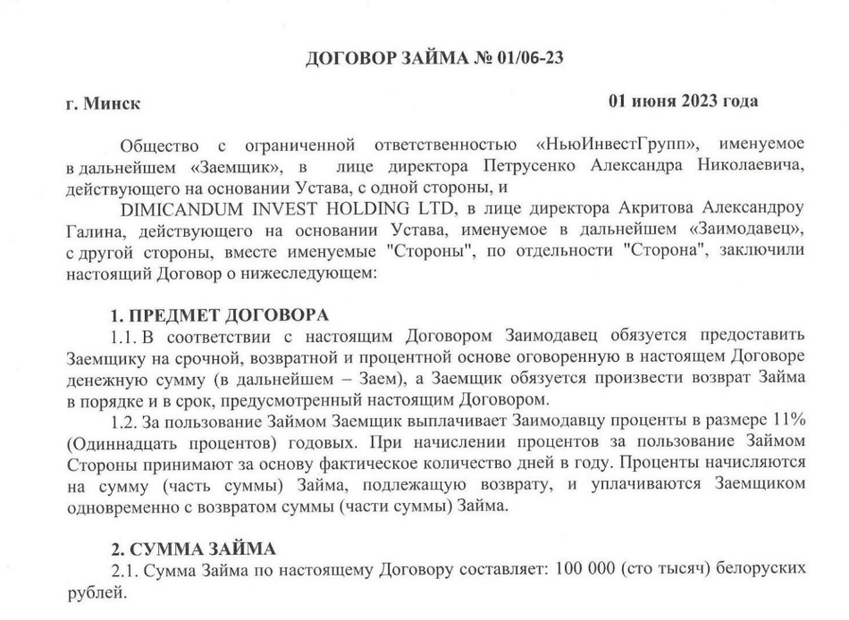 Удзел пералічаных вышэй кампаніяў у схеме абыходу санкцыяў невыпадковы. Іх сувязь пацвярджаюць фінансавыя дакументы за 2023 год, якія мы атрымалі дзякуючы «Рабочаму Руху». У чэрвені кіпрская Dimicandum заключыла з «НьюІнвестГрупп» дзве дамовы пазыкі. [*] [*] У тым жа месяцы тая аформіла пазыку кампаніі «Астрата». [*] Апроч таго, назва расейскай кампаніі, якая часткова належыць Свірыдаву, супадае з назвай украінскага ТАА «Астрата», замешанага ў справе аб незаконным рээкспарце аўтамабіляў, у якой фігуруе кампанія Rostumel. [*] [*]