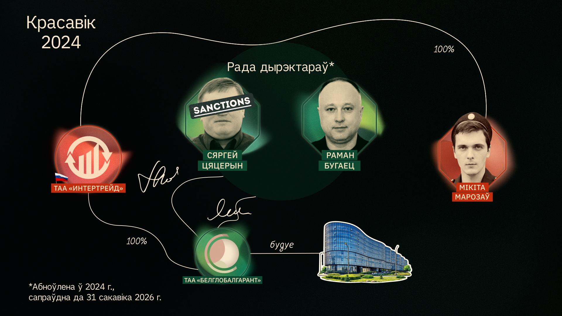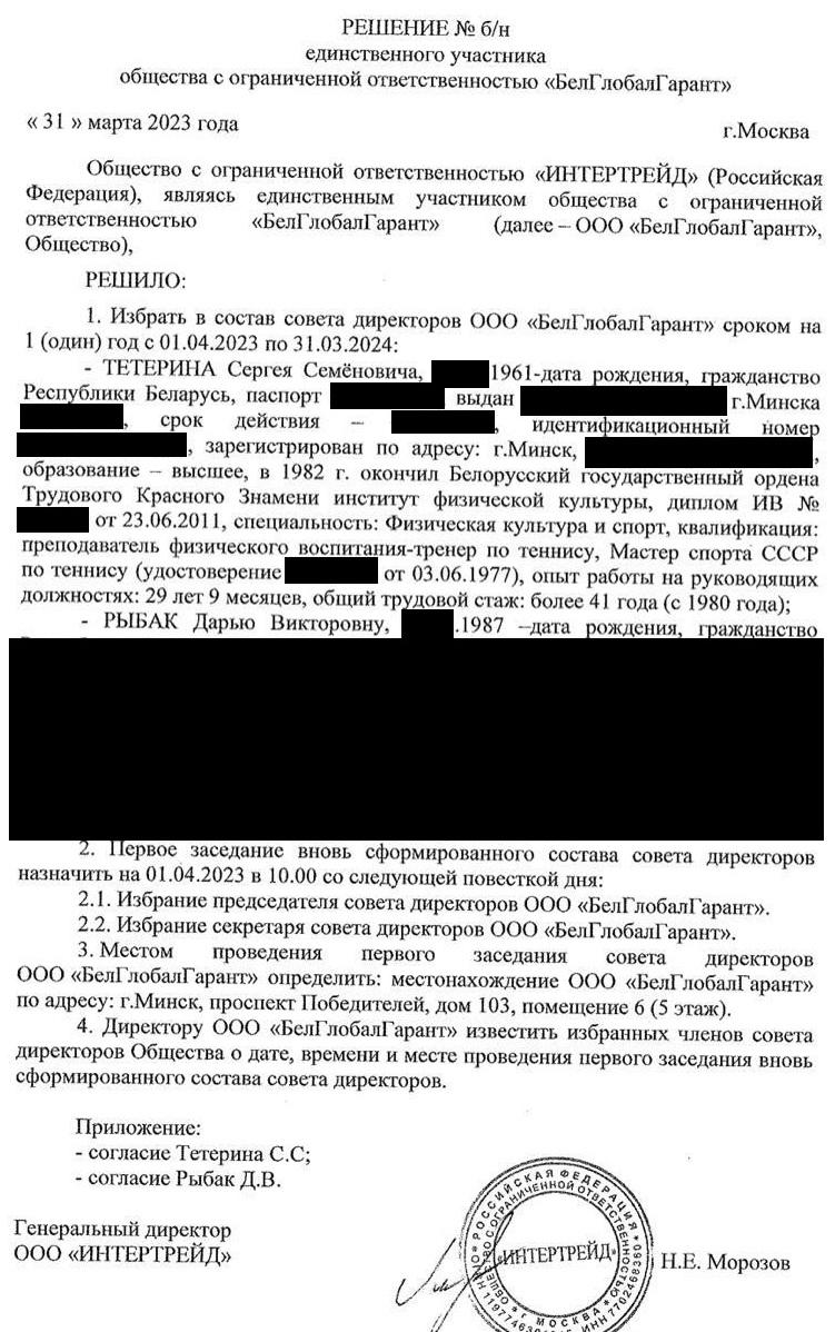 Крыніца: БРЦ / Раней «БелГлобалГарант» належаў Сяргею Цяцерыну і чальцу праўлення РГА «Беларуская тэнісная федэрацыя» Раману Бугайцу. У траўні 2021 года, за месяц да ўвядзення санкцый ЕЗ супраць Цяцерына, права ўласнасці перадалі расейскай кампаніі ТАА «Интертрейд». Яе ўладальнік на момант публікацыі – жыхар Варонежу Мікіта Марозаў. Марозаў стварыў у кампаніі раду дырэктараў, але не ўвайшоў у яе. Затое ўвайшлі былыя ўласнікі – Цяцерын і Бугаец