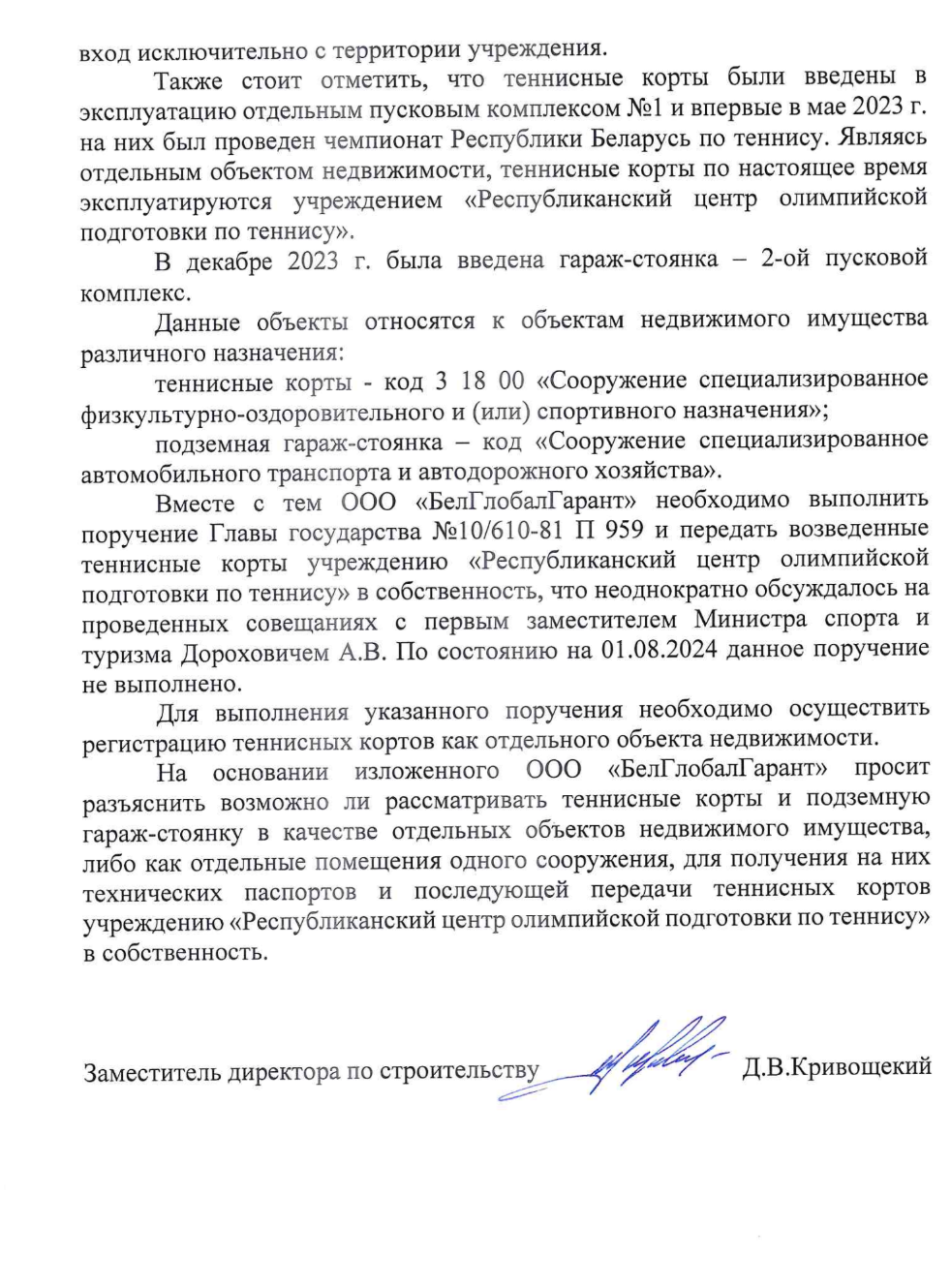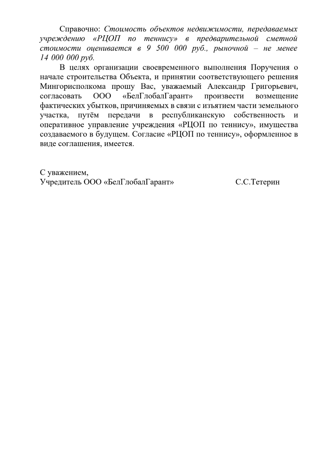 У 2020 годзе «БелГлобалГарант» у каштарысах ацаніў аб’екты нерухомасці, якія планаваў перадаць на баланс РЦАП па тэнісе, у 9,5 млн беларускіх рублёў (каля $3,5 млн), а іх рынкавы кошт — не менш за 14 млн рублёў (каля $5 млн). Аднак фактычныя выдаткі кампаніі былі значна меншыя, напрыклад, будаўніцтва тэнісных кортаў каштавала каля мільёна беларускіх рублёў. [*] [*] [*] [*] Паводле бізнес-плану, на гасцініцу разам з адпаведнай інфраструктурай павінны былі выдаткаваць 5 млн беларускіх рублёў. Колькі каштавала будаванне гатэля ў выніку і ці было яно скончана, мы не ведаем: у акце прыёмкі ў эксплуатацыю абʼекта ад 12 студзеня 2024 года гатэля няма. На кадастравай мапе мы яго таксама не знайшлі. [*]
