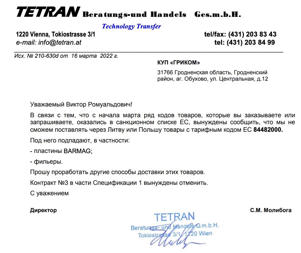 The intermediary sent an inquiry to Tetran. The response arrived in March 2022, after Russia had launched its full-scale invasion of Ukraine and the EU had imposed sanctions on Belarus for being an ally of the aggressor. European companies were prohibited from supplying such equipment not only to Grodno Azot, but to Belarus as a whole. Tetran's owner, Sergej Moliboga, declined to sell the parts.