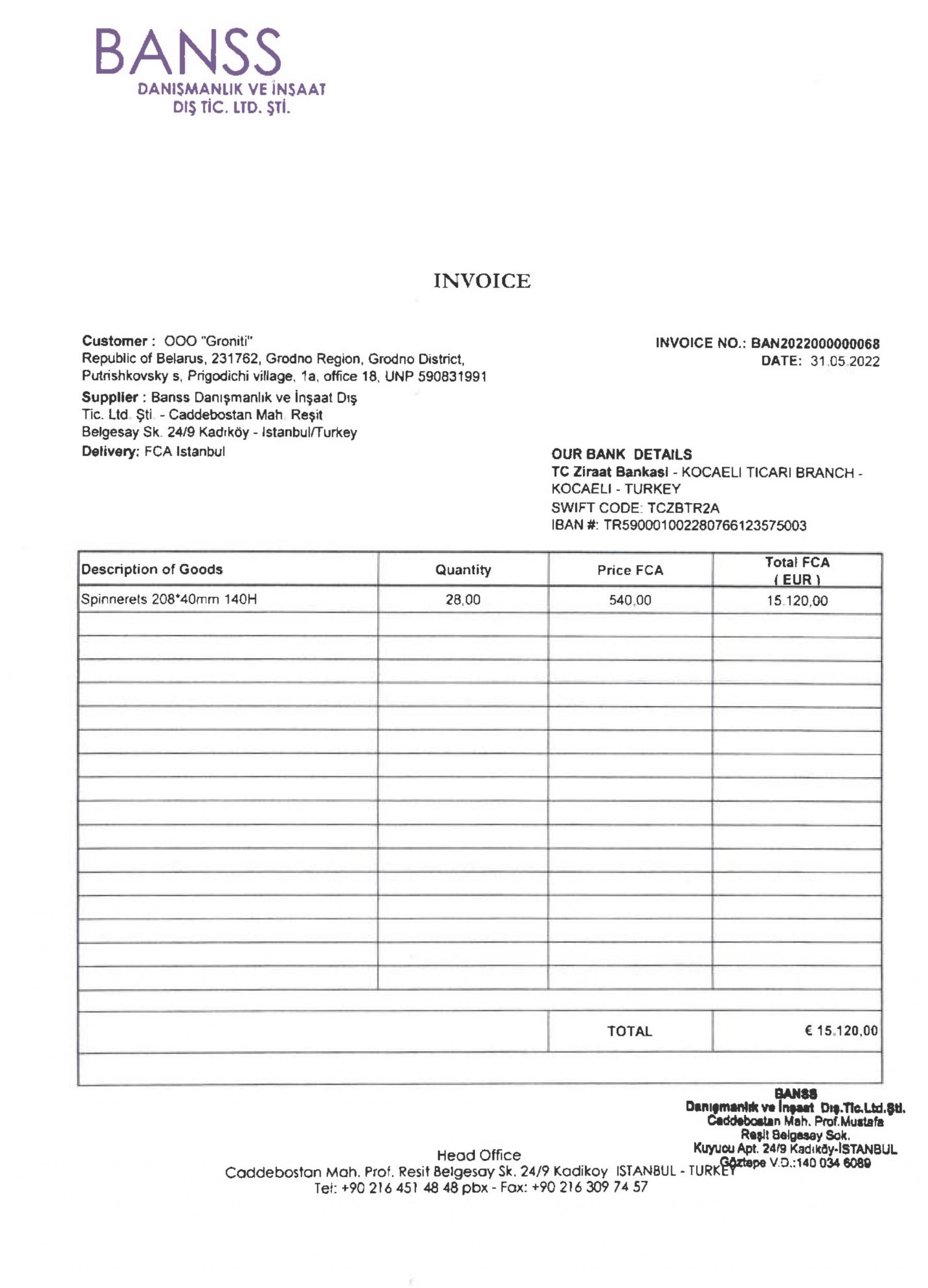 Another way was found indeed. A document package from May 2022 provided to the BIC by Rabochy Ruсh shows that Grodno Azot did purchase the spinnerets through intermediaries. The first intermediary was the Turkish company Banss Danişmanlik ve İşaat Diş Ti̇caret Li̇mi̇ted Şi̇rketi̇.