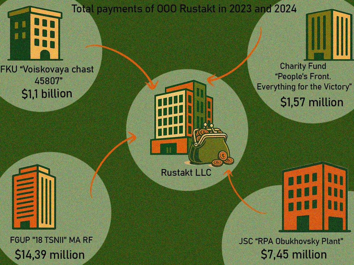 However, according to a source in Russia’s tax service, payments received by Rustakt from clients turned out to be almost three and a half times higher: during 2023 and 2024, just four organizations paid the company $1.12 billion for goods and services. All four are connected to the defense sector: