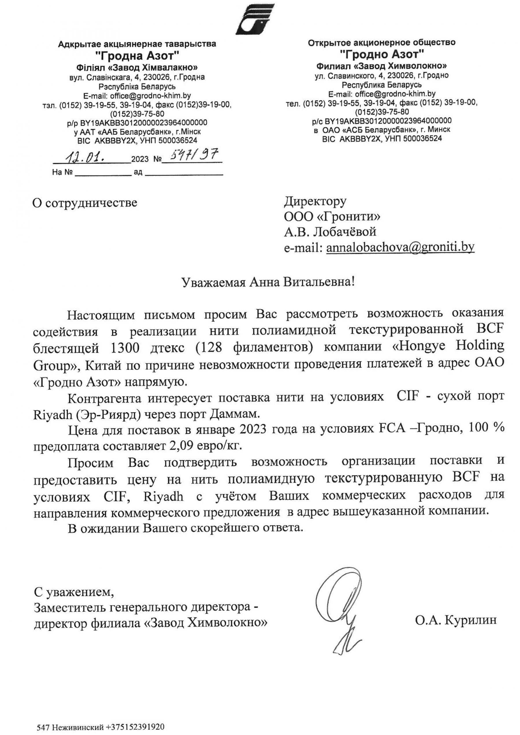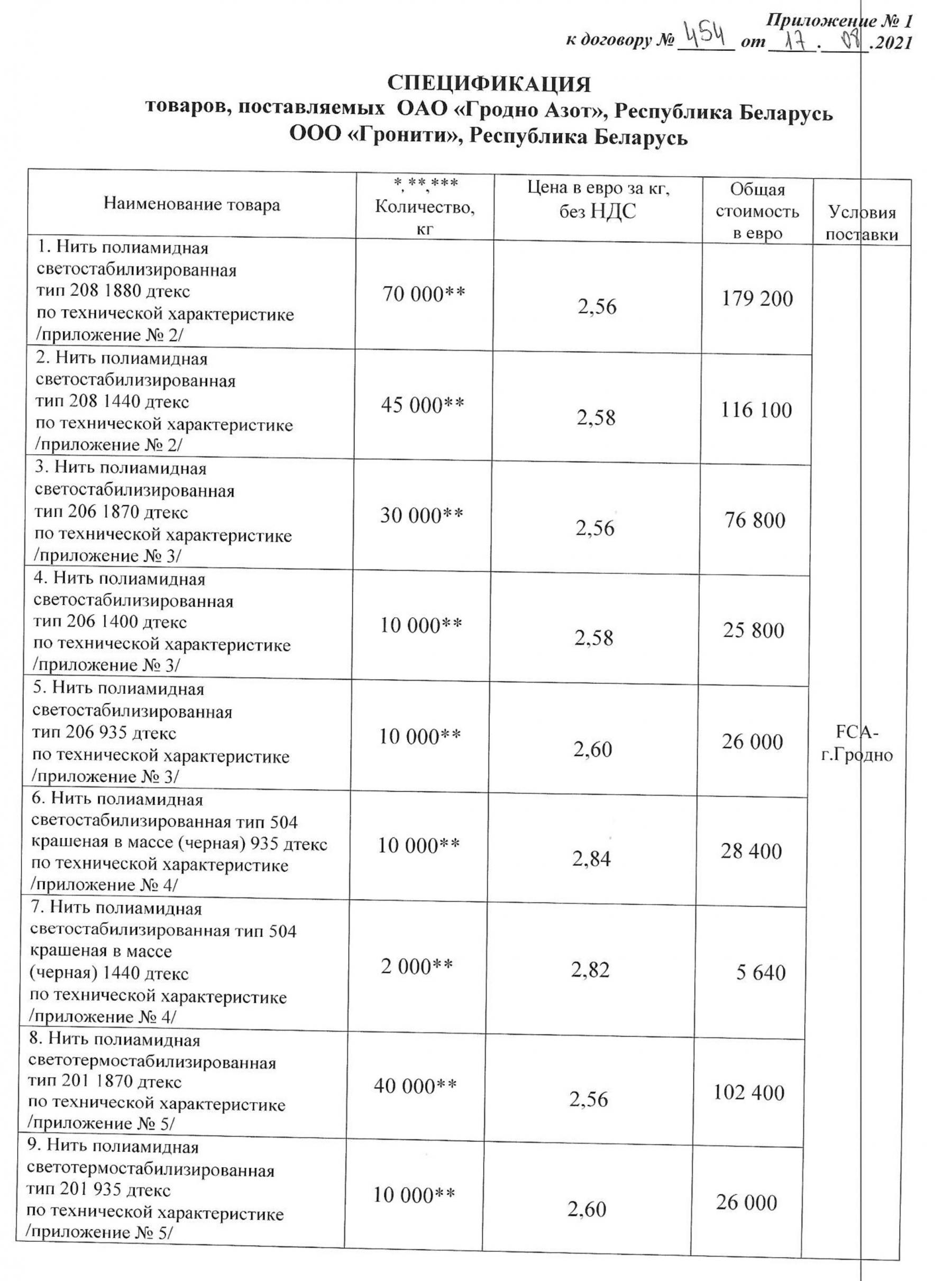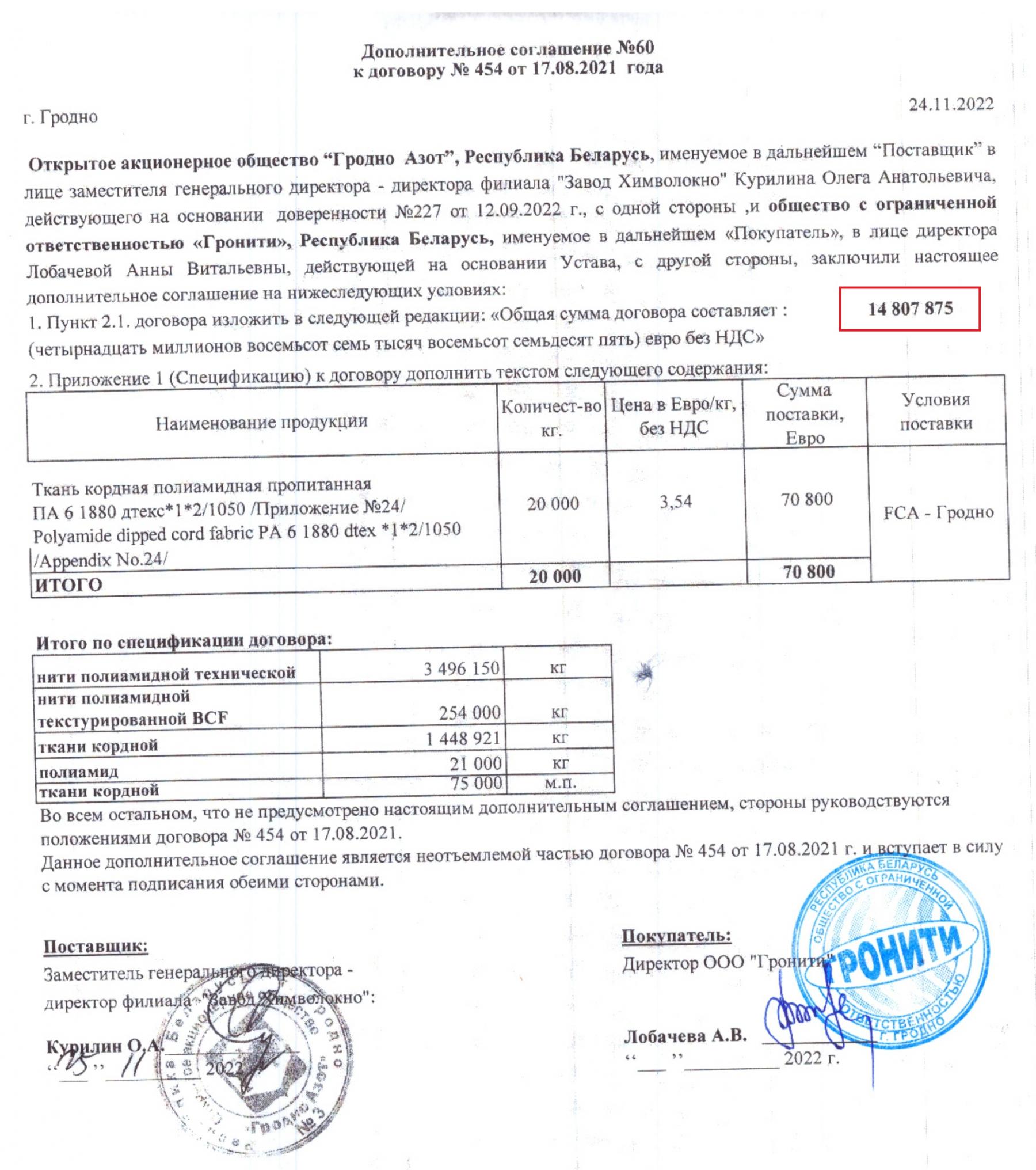 Роль «Гронити» в поставках запрещенной продукции в ЕС подтверждает документ, который БРЦ получил от инициативы «Рабочы рух». Компания подписала с «Гродно Азотом» договор №454 в августе 2021 года «для вывоза из Республики Беларусь в полном объеме» полиамидной нити на почти €650 тыс. [*] [*] [*] После этот документ обновляли и расширяли список продукции на вывоз. [*]