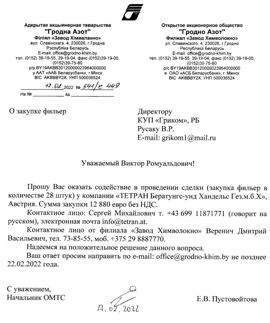 Посредник направил запрос в Tetran. Ответ на него пришел в марте, когда уже началась полномасштабная война России против Украины и ЕС ввел санкции против Беларуси как союзницы агрессора. Европейским компаниям запретили поставлять такое оборудование не только «Гродно Азоту», но и вообще в Беларусь. Вероятно, поэтому собственник Tetran Сергей Молибога отказался продавать детали. Однако формулировки в его письме выглядели как намек на возможность обхода ограничений: