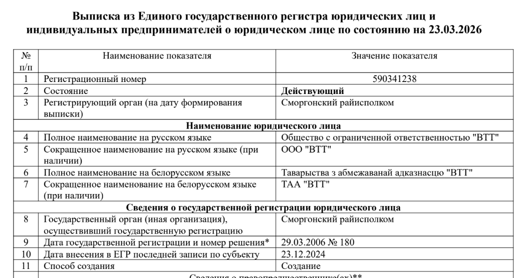Четверо из пяти учредителей компании, которая заняла второе место в нашем рейтинге, связаны родственными отношениями. Сморгонским ООО «ВТТ» владеют сестры Лидия Гулецкая и Полина Ролевич (обе до замужества Высоцкие), их мать Наталья и дядя Авенир. Пятый — знакомый семьи Рустем Моисеев. [*] [*] Публичной информации о тройке последних мало, например, мы знаем, что Наталья и Авенир на пенсии. Лидия и Полина связь с компанией не афишируют: первая занимается режиссурой, вторая в инстаграме рассказывает о кондитерском деле. Все вместе они зарабатывают в том числе на контрактах с российскими производителями оружия.