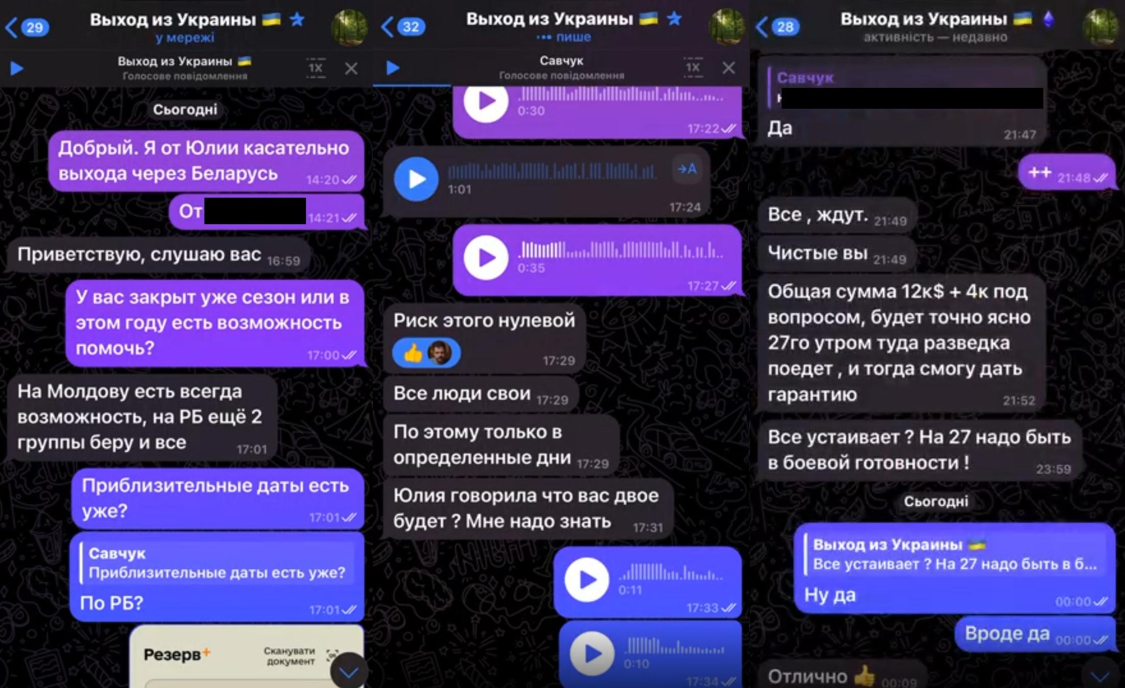 Журналист БРЦ пообщался с представителем одной из таких групп в Telegram. Тот предложил купить проверенный маршрут побега из Украины либо оплатить услугу «под ключ»: заказать авто с опытным водителем, который объедет блок-посты в Украине и привезет к границе, когда на беларусской стороне будет дежурить «своя смена» пограничников. За помощь в нелегальном выезде для двоих мужчин собеседник запросил $16 тыс. Эта стоимость включает организацию побега в Беларусь, а потом — в ЕС.